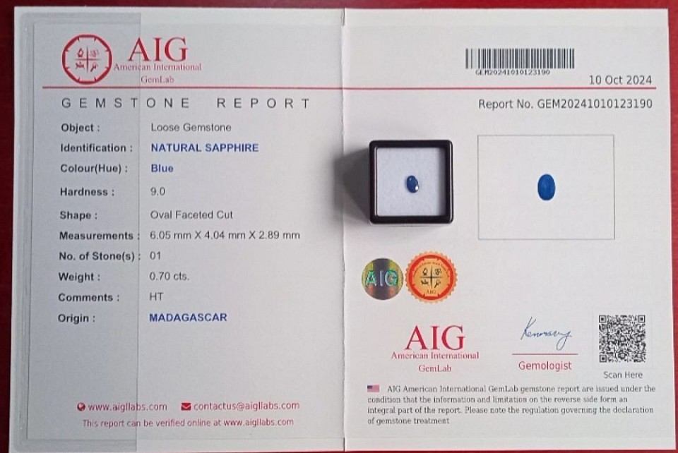 🔹 0.70 cts AIG Certified Oval Faceted Natural Blue Sapphire.