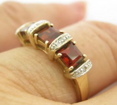 •9ct Gold Princess Cut Garnet & Diamond Ring UK Size P. This 9ct gold ring is in excellent condition and is set with three princess cut garnets that measure approximately 0.4cm squared. The garnets are bright and vibrant in colour and are flanked by small round cut diamonds. It is stamped DIA for diamond and it is hallmarked London with import markings. Weight 2.9 grammes.